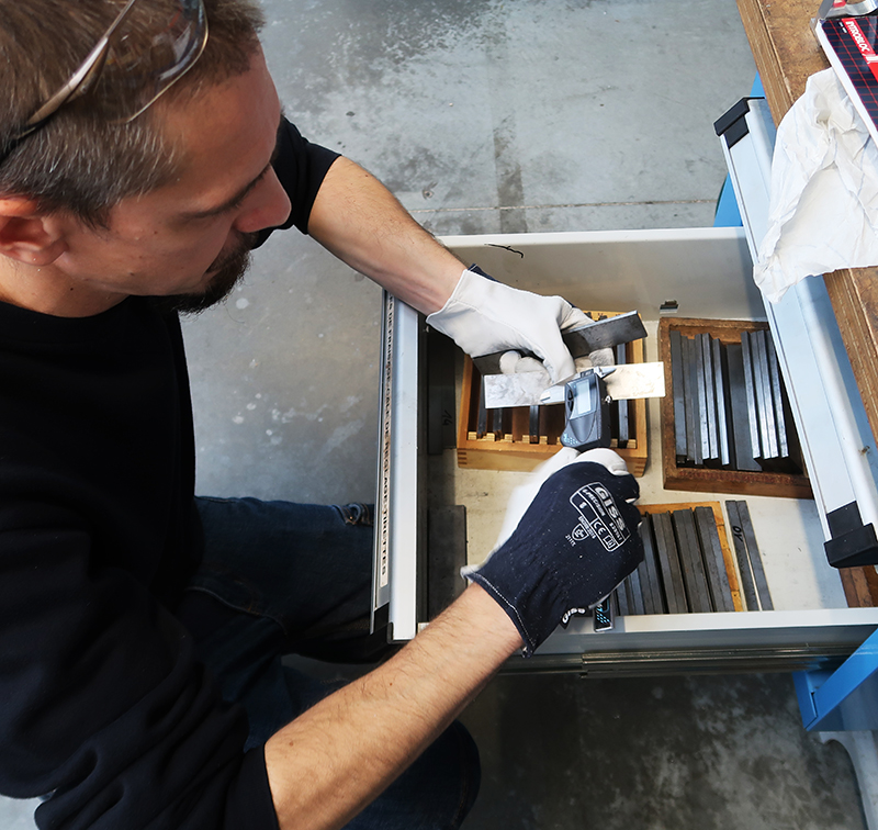 A proximité de la cisaille sont stockées des plaques d'acier de différentes dimensions et épaisseurs