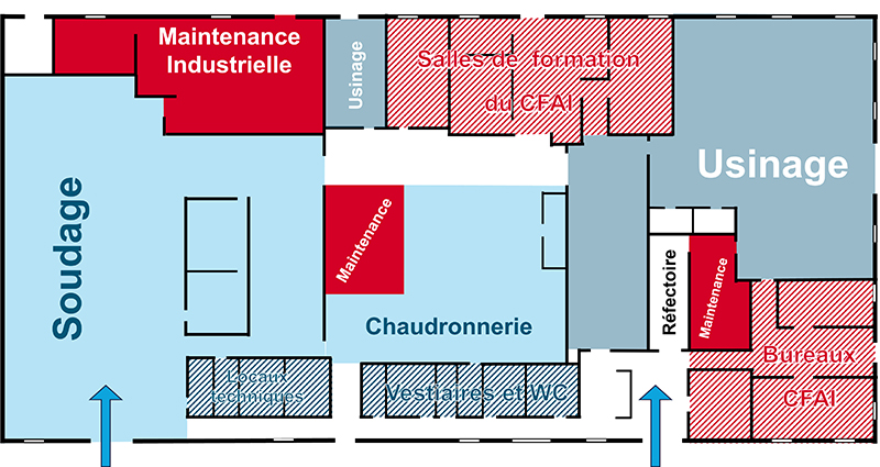 Dédiés aux formations en Chaudronnerie et Soudage l'espace découpe au premier plan et les 2 salles de formation au deuxième plan.